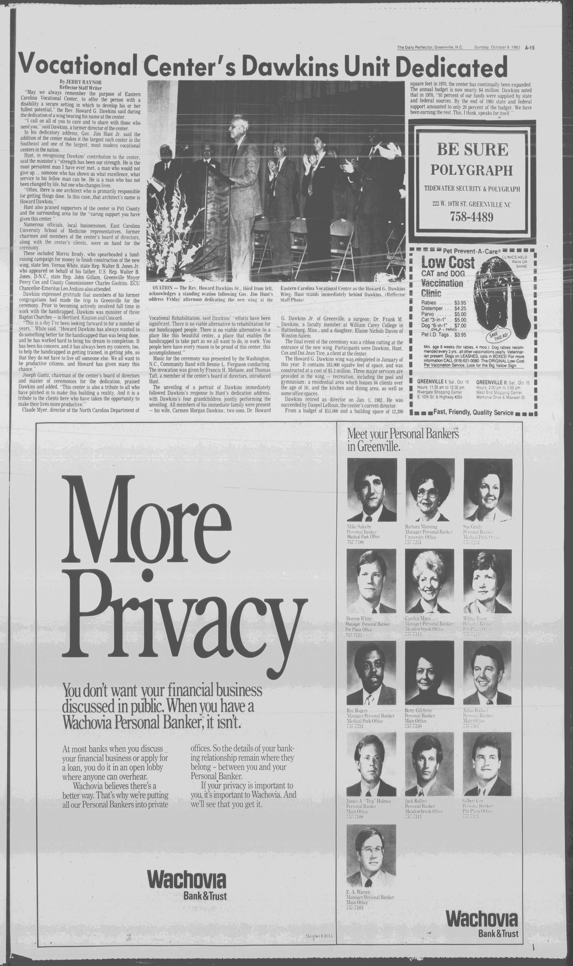 The new Howard Dawkins wing of the Eastern Carolina Vocational Center has been dedicated. Story on A-15.