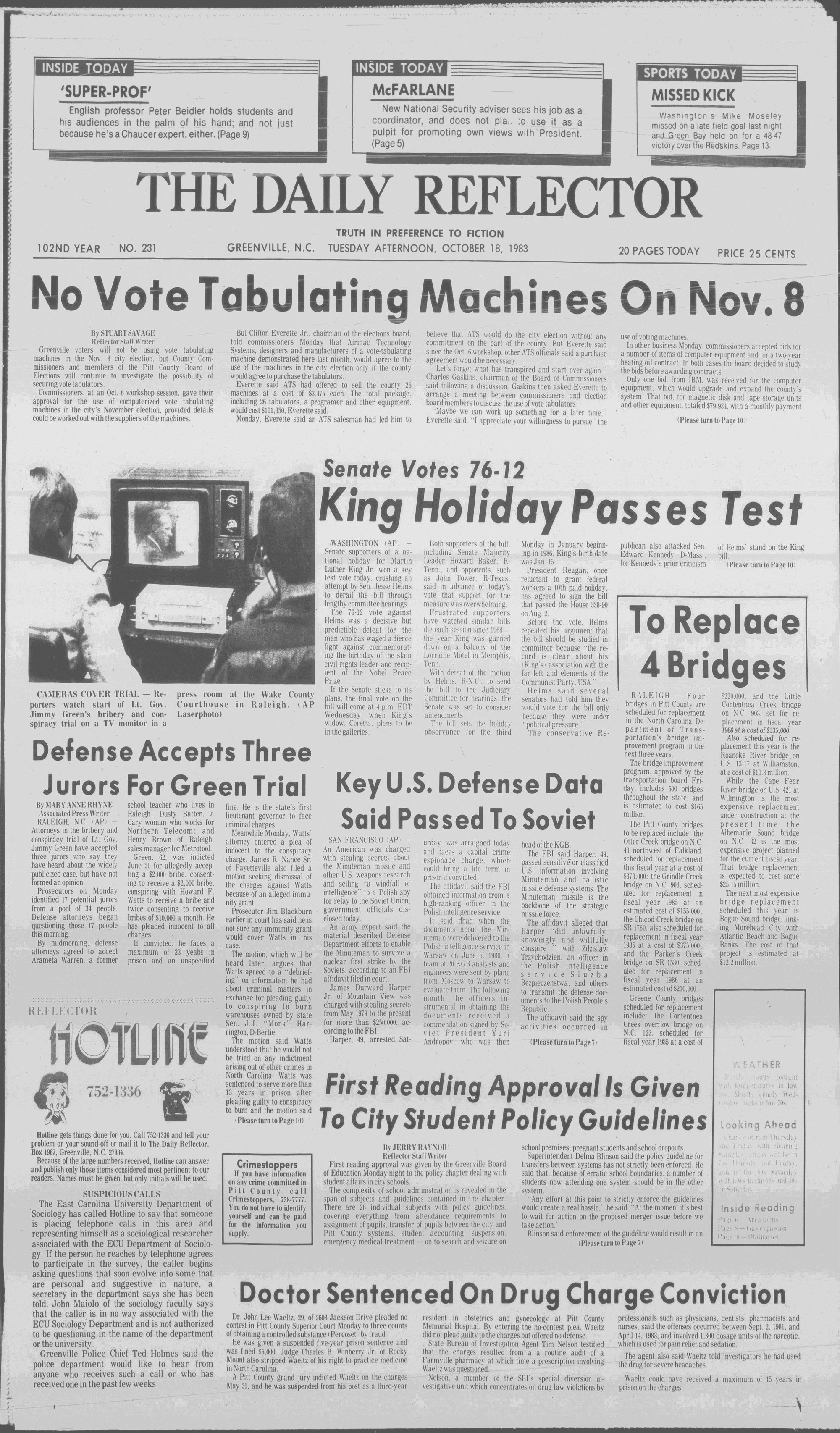 BySTUARTSAV.AGE Reflector Staff W riter Greenville voters will not be using vote tabulating machines in the Nov. 8 city election, but County Commissioners and members of the Pitt County Board of Elections will continue to investigate the possibility of securing vote tabulators.