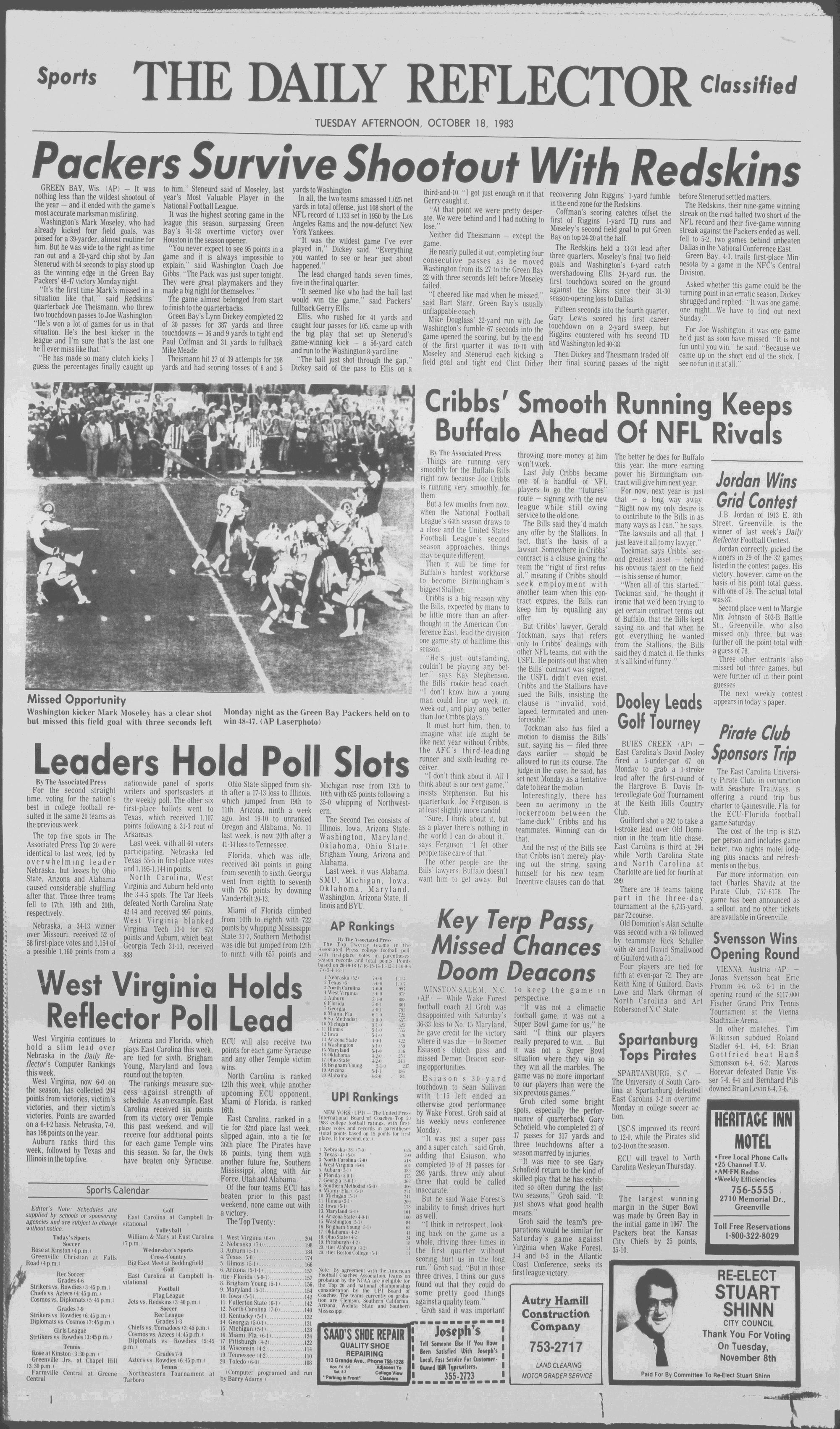 Washingtons Mike Moseley missed on a late field goal last night and. Green Bay held on for a 48-47 victory over the Redskins. Page 13.THE DAILY REFLECTOR