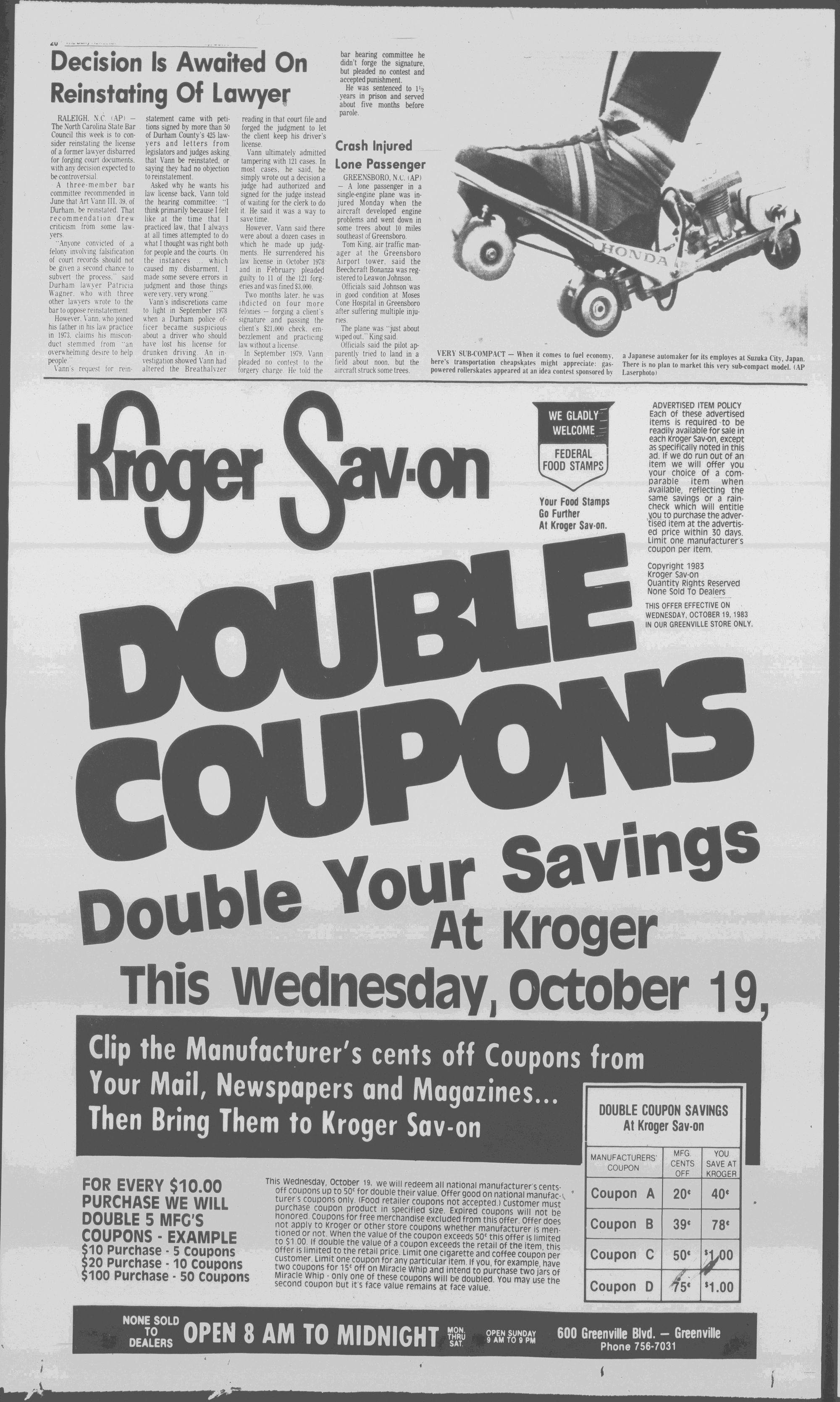 THIS OFFER EFFECTIVE ON v WEDNESDAY, OCTOBER 19,1983 IN OUR GREENVILLE STORE ONLY.
