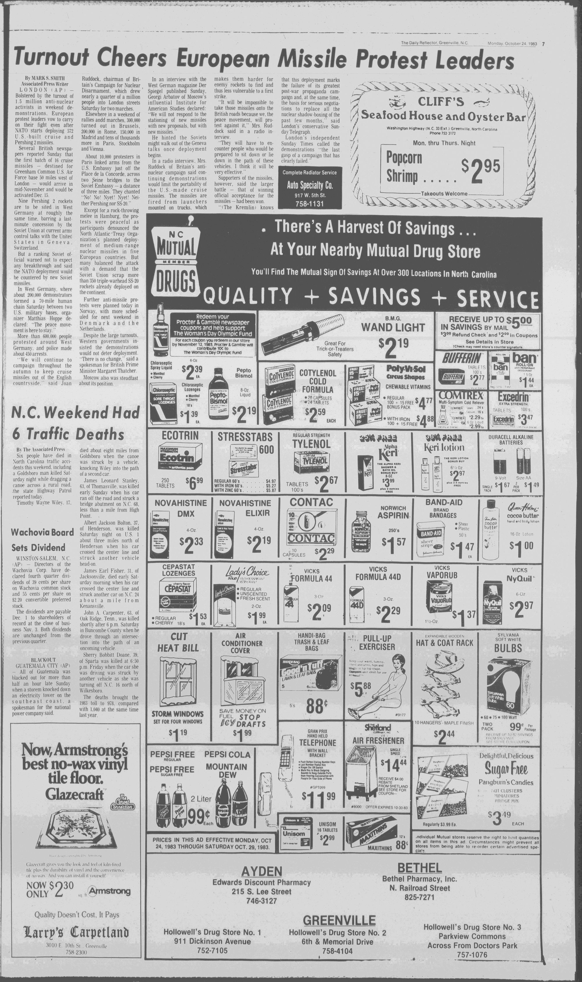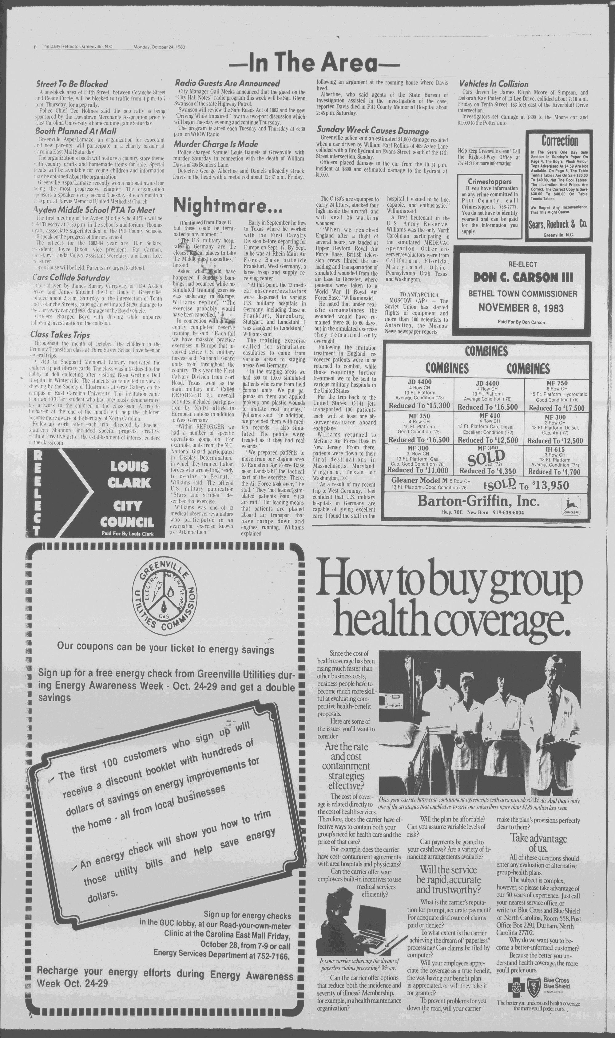 7 (K) a m - (ireenville Breakfast I.ions Club meets at Three Steers lo iKi am- Kiwanis (iolden K Club meets at Masonic Hall 7 00 p m Family Support (iroup at Family Practice Center 7 IK) pm - I CAN COPE at Gaskins Leslie Center, room 124 7 30 pm - Greenville Choral Society rehearsal at Immanuel Baptist Church 7:30 p m - Vernon Howard Success Without Stress study group at llON Warren St 7:30 pm Toughlove parents' support group at St Paul's Episcopal Church H 1)0 p ni - Withla Council, Degree of Pocahontas meets at Hotary Club K IK p m - Pitt Co Alcoholics Anonymous at AA BIdg , Farmville hwy.