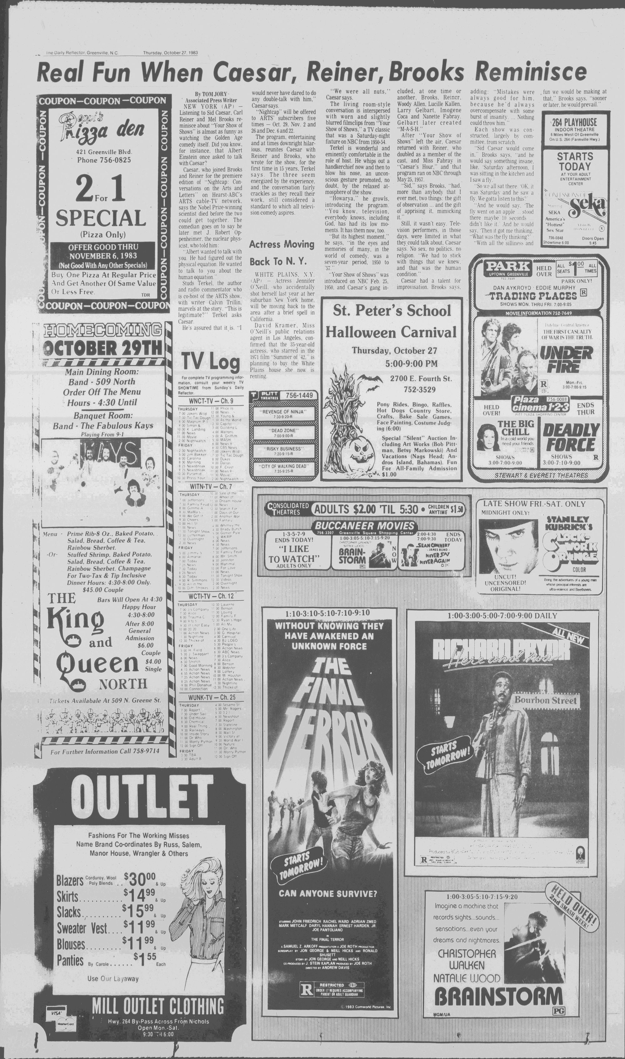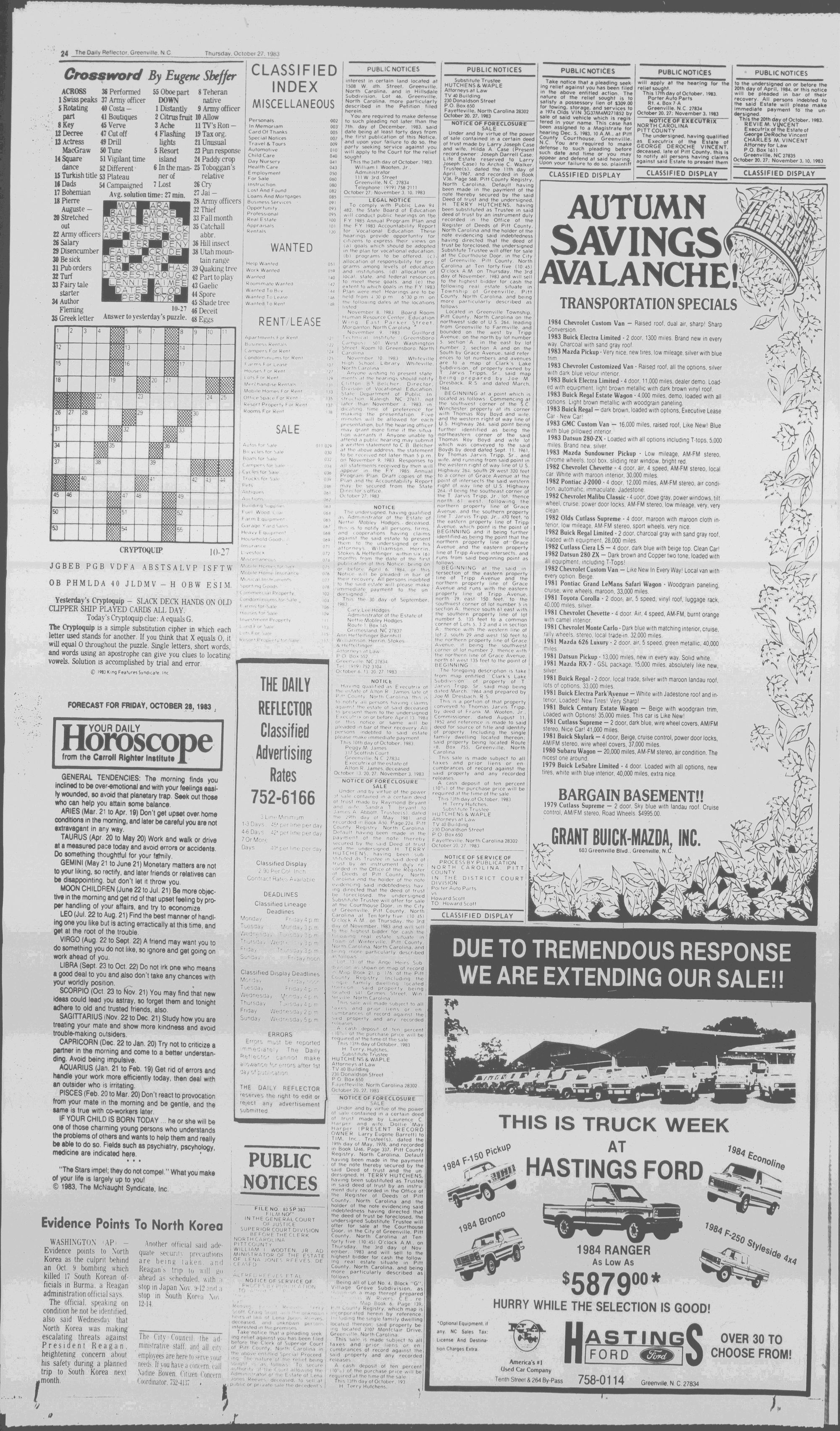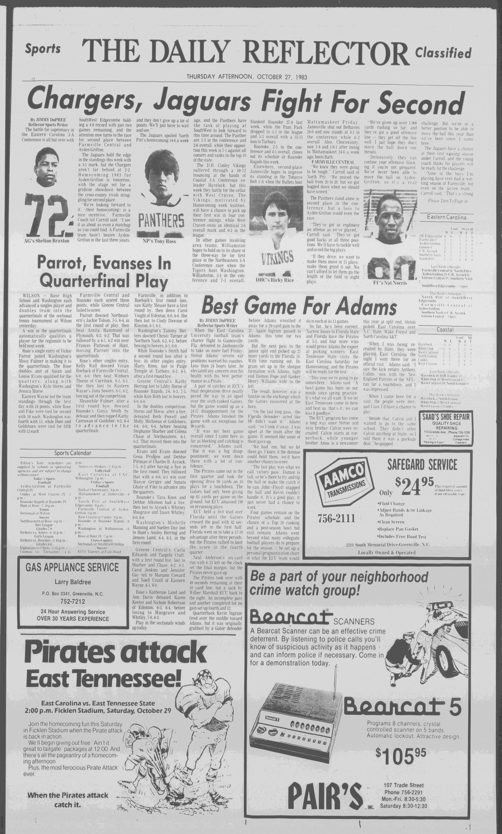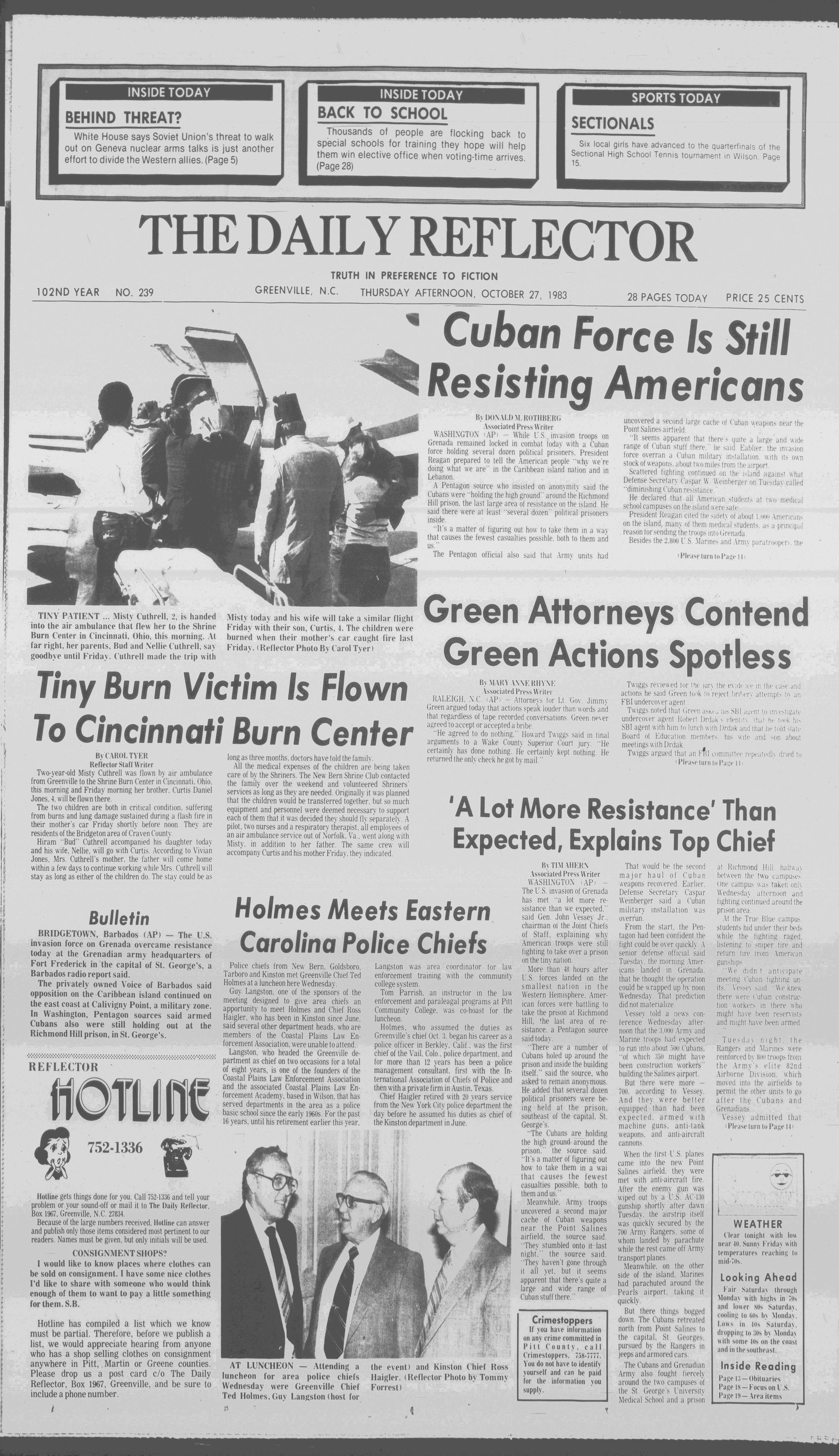 102NDYEAR NO. 239TRUTH IN PREFERENCE TO FICTIONGREENVILLE, N.C. THURSDAY AFTERNOON, OCTOBER 27, 1983