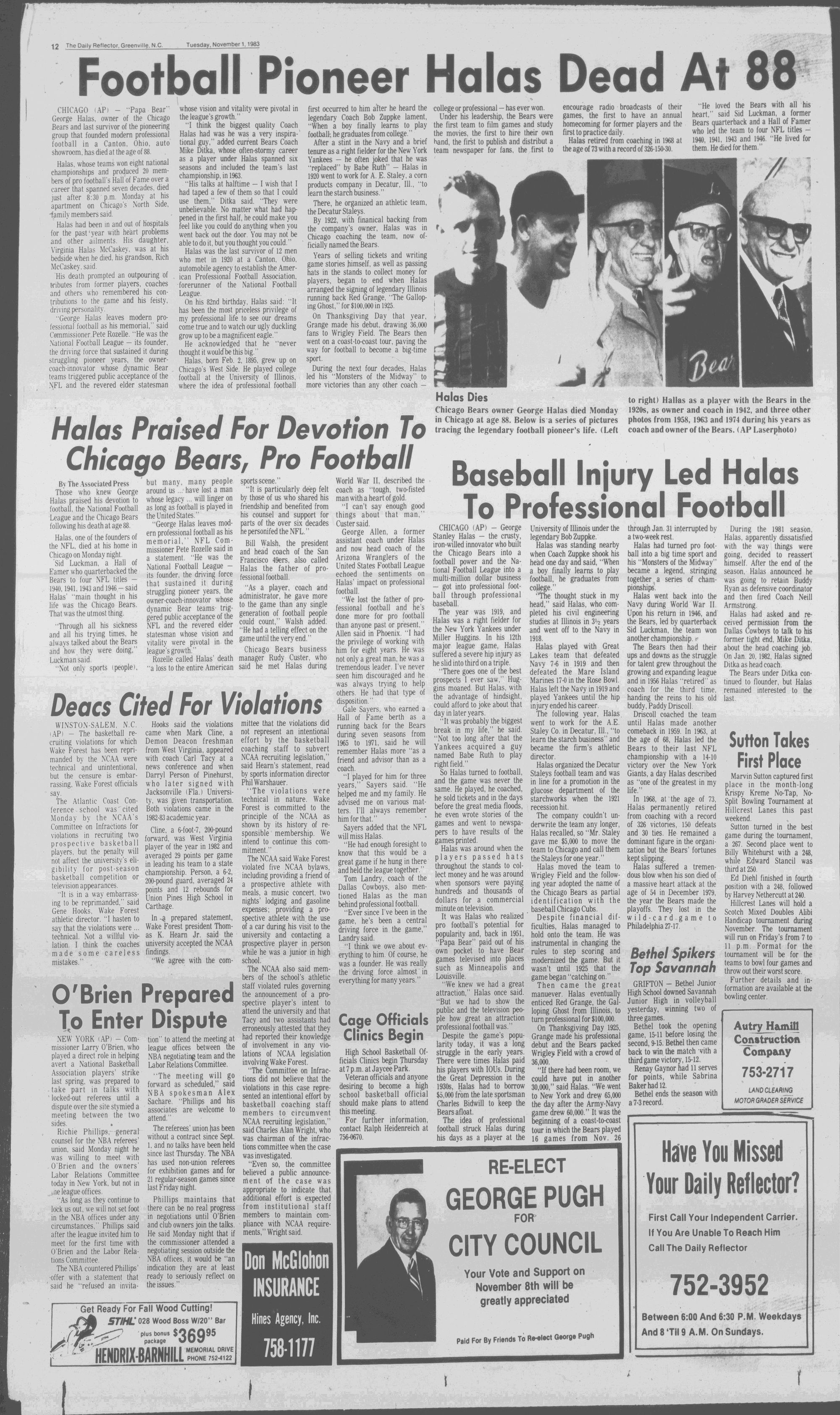 George Haias, the famed "Papa Bear of the Chicago Bears is dead at the age of 88, ending a long career. Page 12.THE DAILY llEFLEGTOR