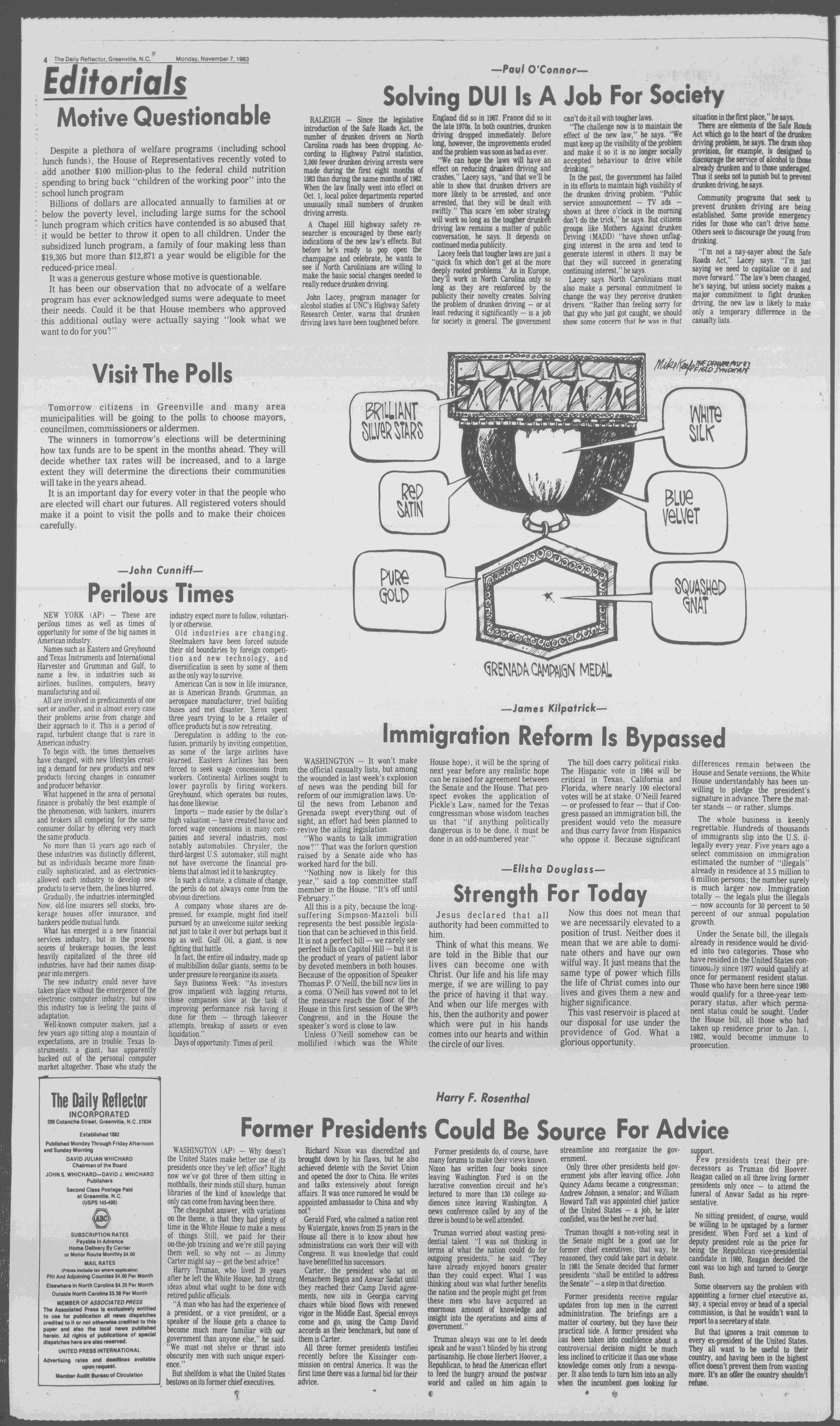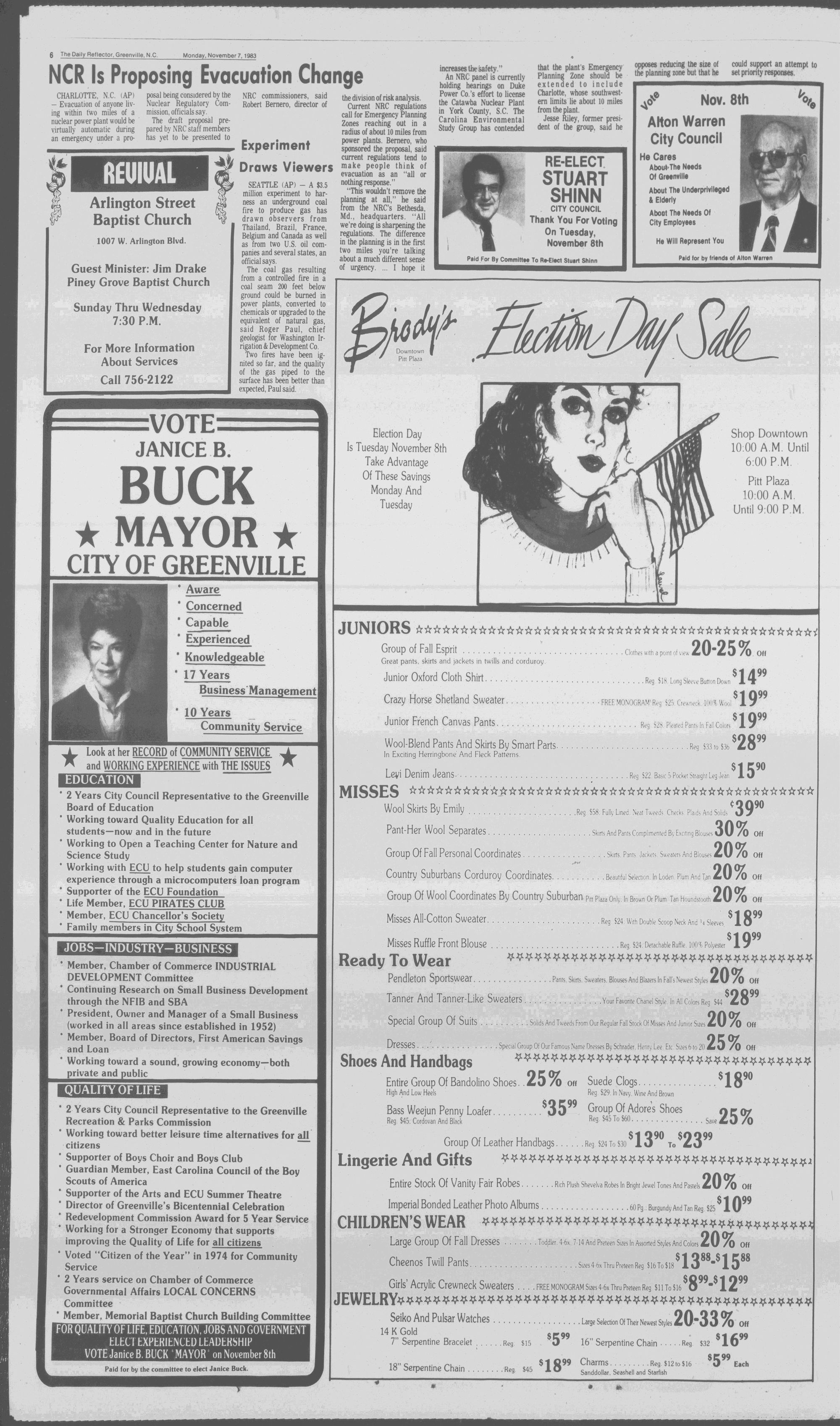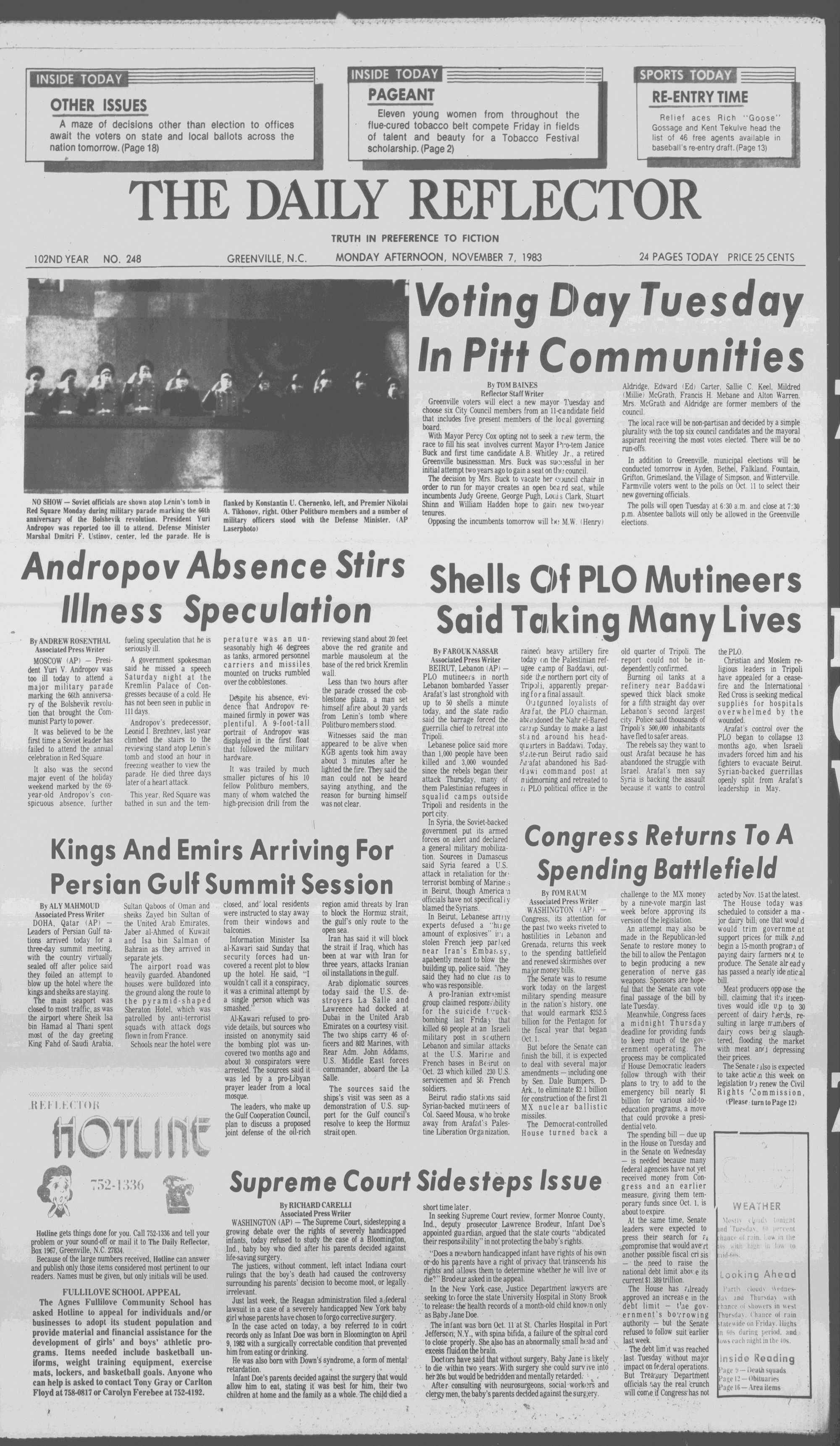 The newspaper was established in 1882, and was originally named the Eastern Reflector. It was founded by Julian Whichard and David Jordan with equipment they purchased from The Greenville Express. On December 10, 1894, it adopted the name The Reflector and began publishing every day. Cox Newspapers acquired The Daily Reflector in 1996. Creator: Daily Reflector (Greenville, N.C.)