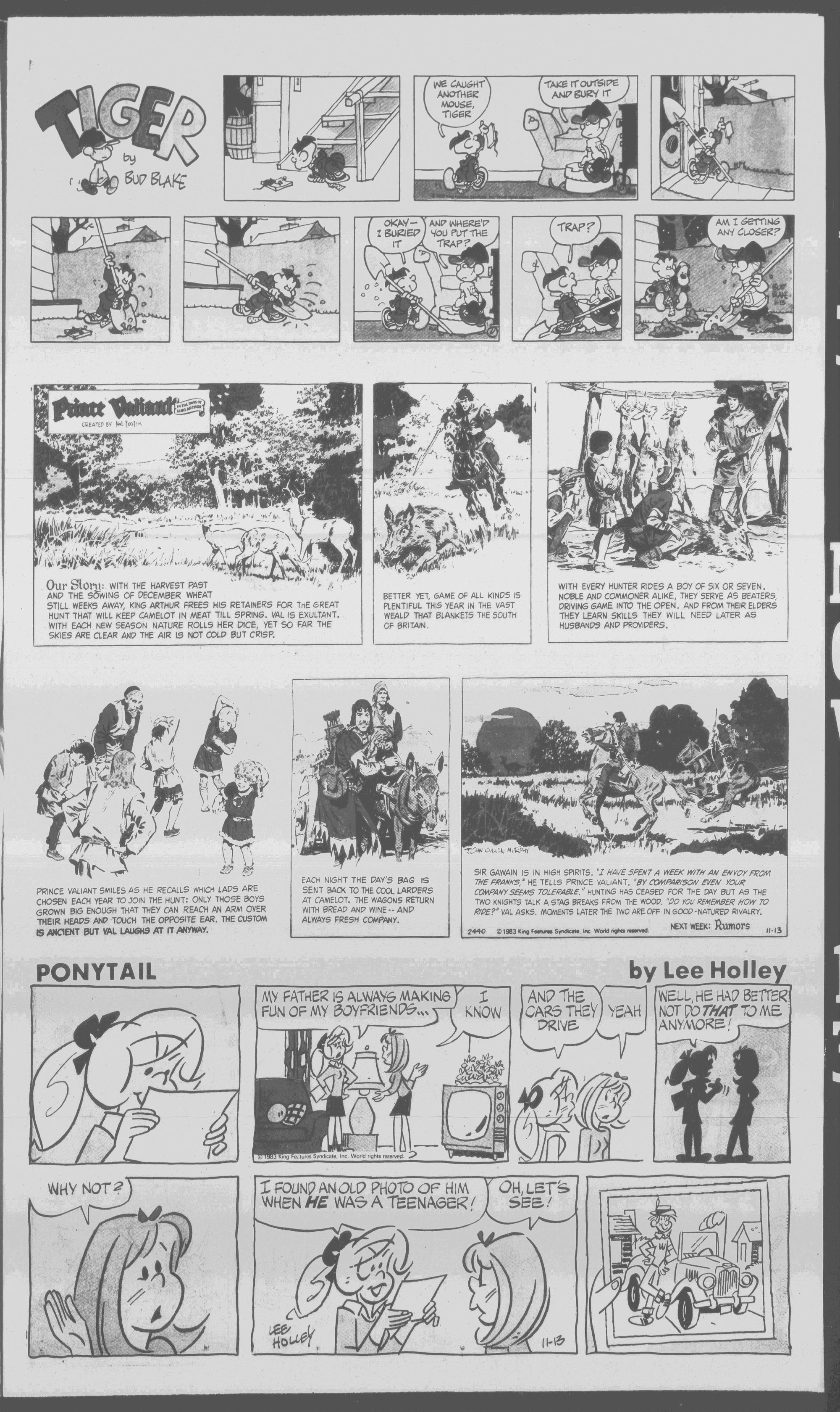 PRINCE VALIANT SMILES AS HE RECALLS WHICH LAPS ARE CHOSEN EACH YEAR TO JOIN THE HUNT: ONLY THOSE BOYS grown big enough that THEY CAN REACH AN ARM OVER THEIR HEAPS ANP TOUCH THE OPPOSITE EAR. THE CUSTOM tS ANOENT BUT VAL LAUGHS AT IT ANYWAY.