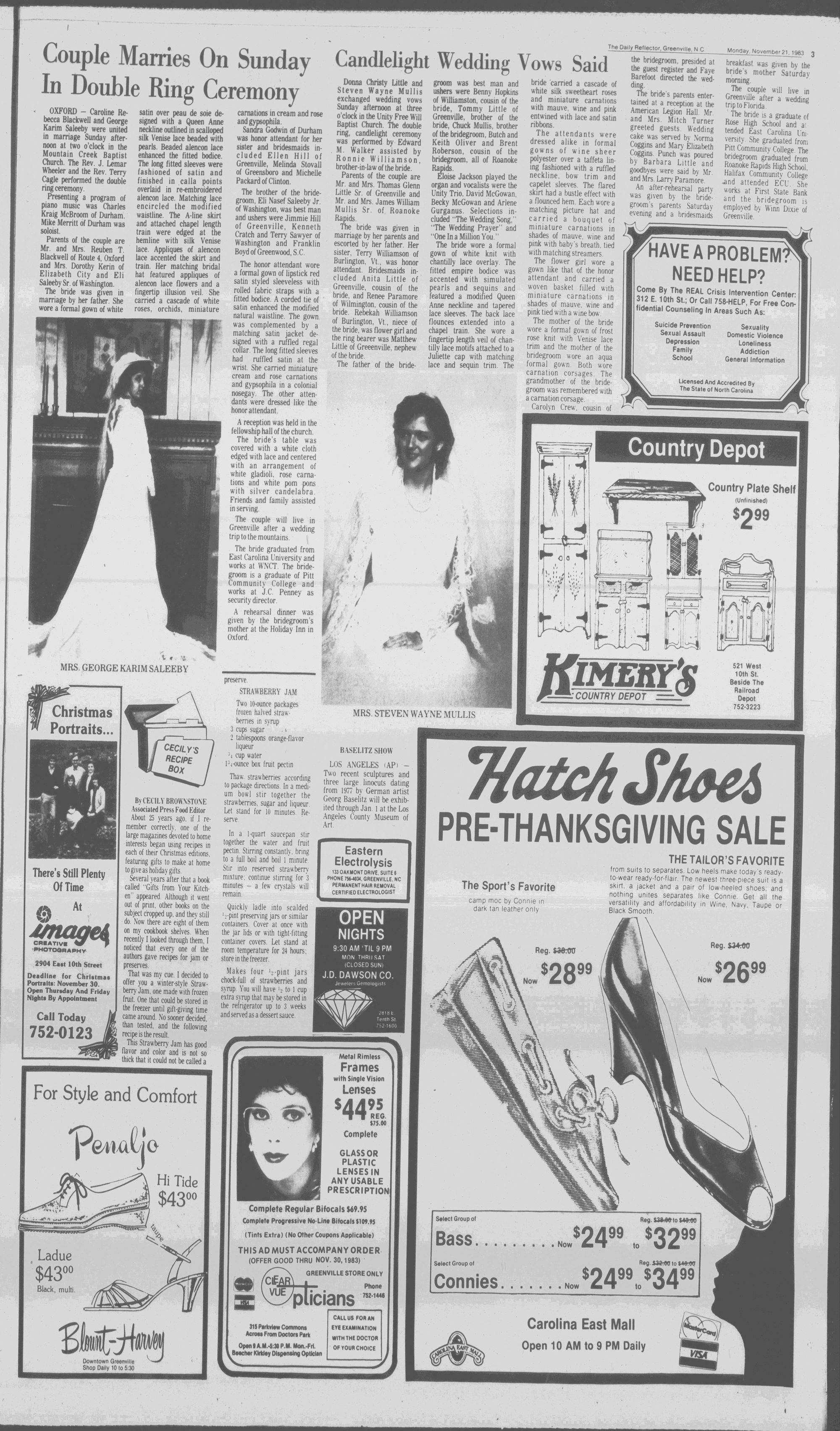 Donna Christy Little and Steven Wayne Mullis exchanged wedding vows Sunday afternoon at three oclock in the Unity Free Will Baptist Church. The double ring, candlelight ceremony was performed by Edward . M. Walker assisted by Ronnie Williamson, brother-in-law of the bride.