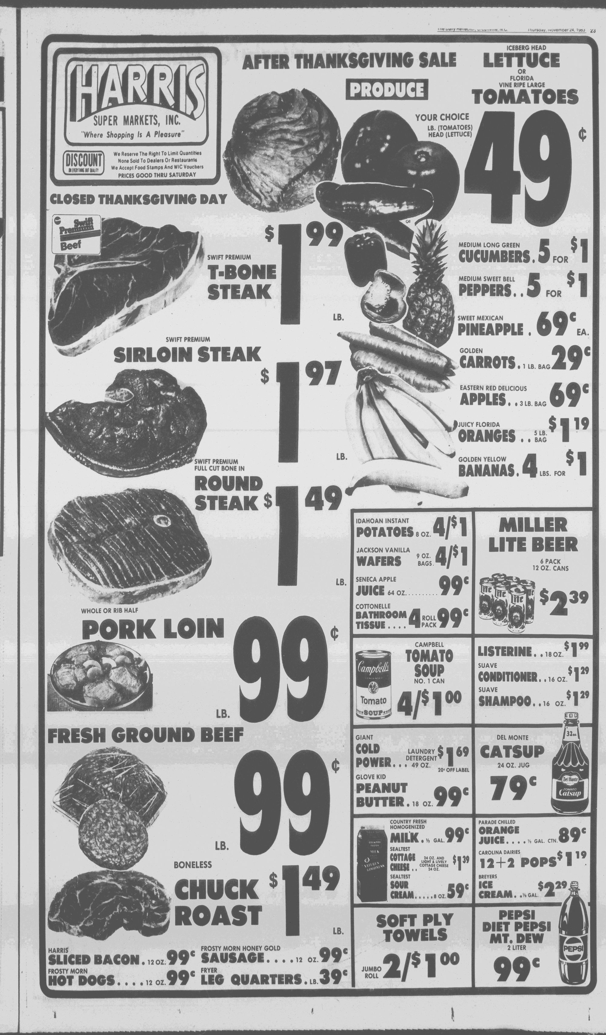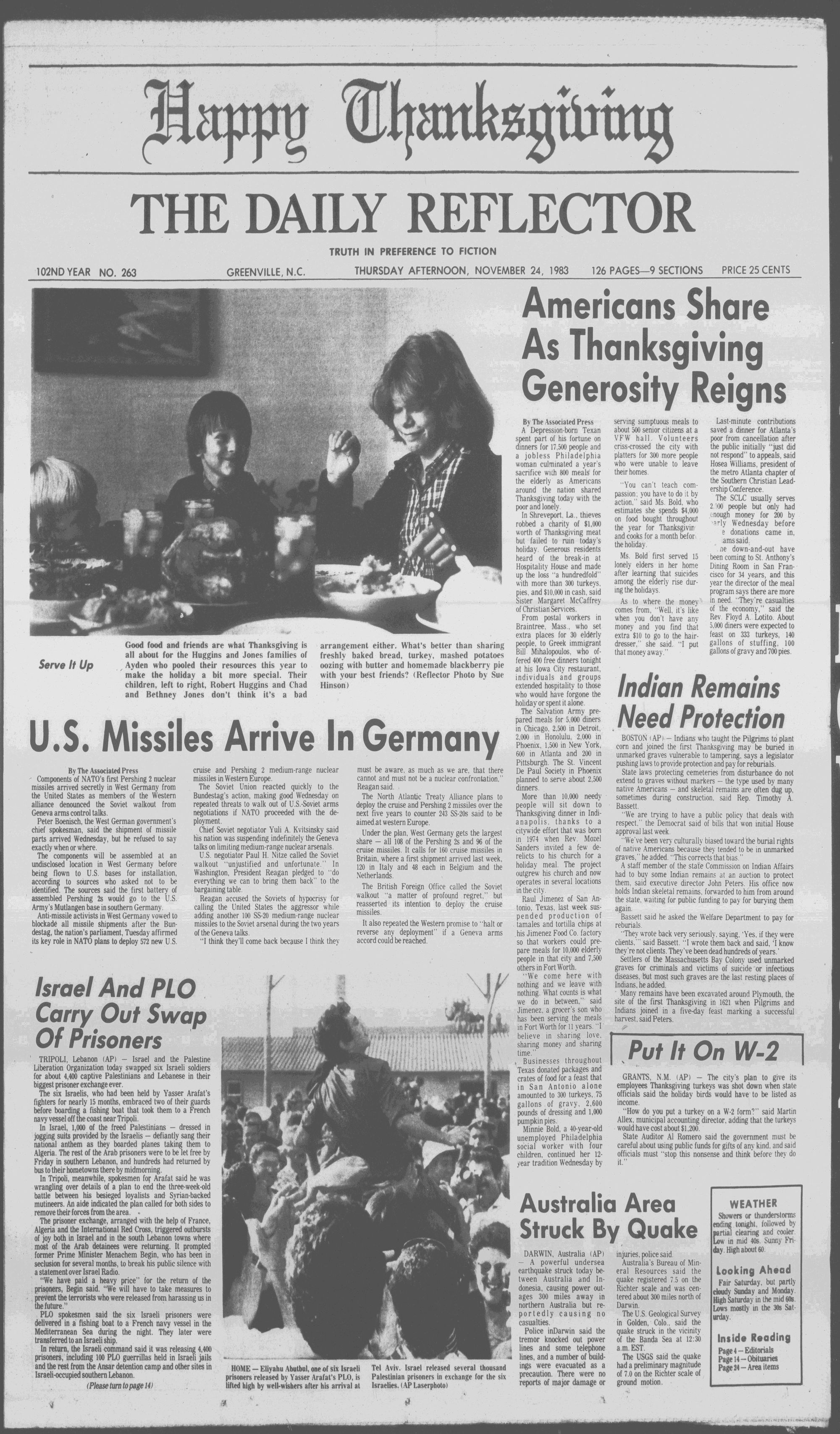 In Shreveport. La., thieves robbed a charity of $1,000 worth of Thanksgiving meat but failed to ruin todays holiday. Generous residents heard of the break-in at Hospitality House and made up the loss a hundredfold" with more than 300 turkeys, pies, and $10,000 in cash, said Sister Margaret McC!affrey of Christian Services.