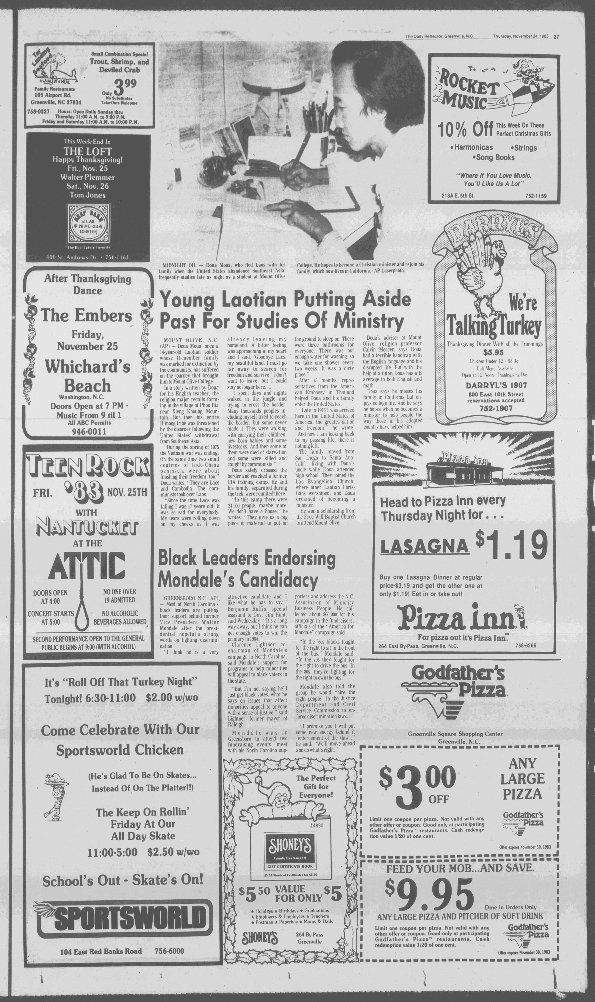 More than 10,000 needy people will sit down to Thanksgiving dinner in Indi-anapolis. thanks to a citywide effort that was bom in 1974 when Rev. Mozel Sanders invited a few derelicts to his church for a holiday meal. The project outgrew his church and now operates in several locations in the city.