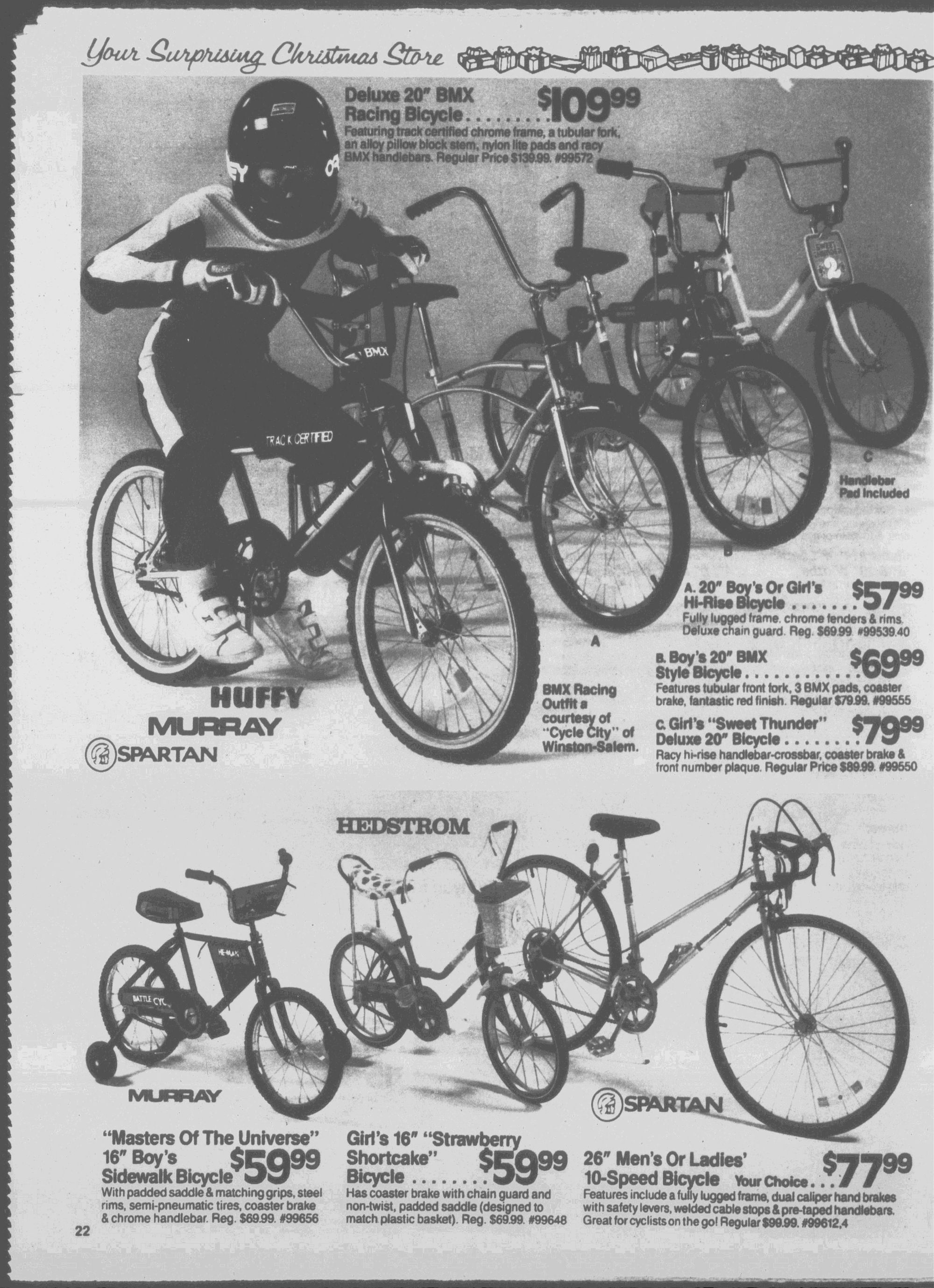 With padded saddle ft matching grips, steel rims, semi-pneumatic tires, coaster brake & chrome handlebar. Reg. $6999. 99656