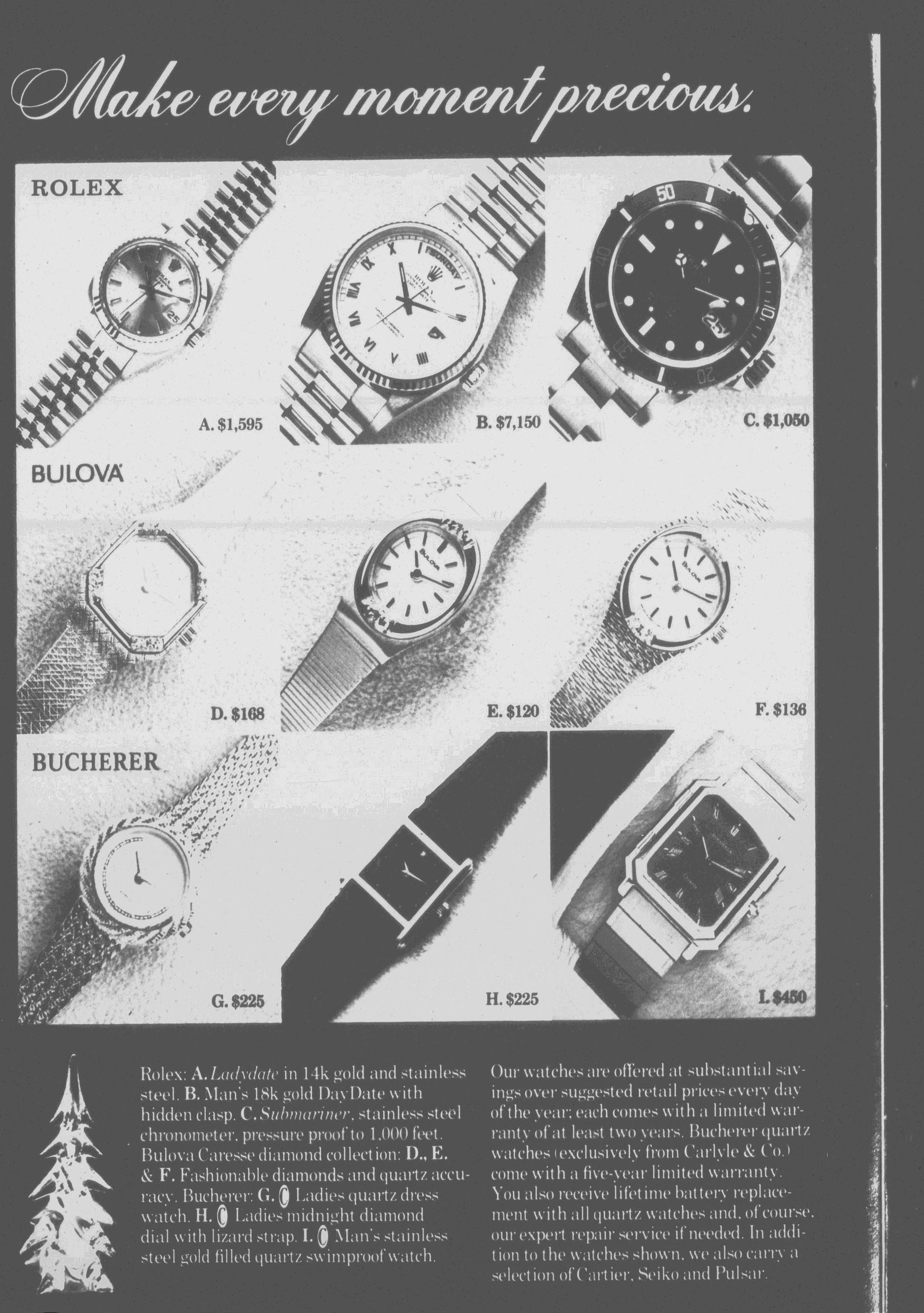 Our watches aI'l'ofl'ert'd at substantial .<av-inps ov('r suiip(stc'(l retail prices evm'v da\ of'the >ear; each comes with a limited wai -rantyof'at least two years. Huchert>r (luartz watches lexclusively I'lom tarlyle ('o.' come with a five-year limited warranty.