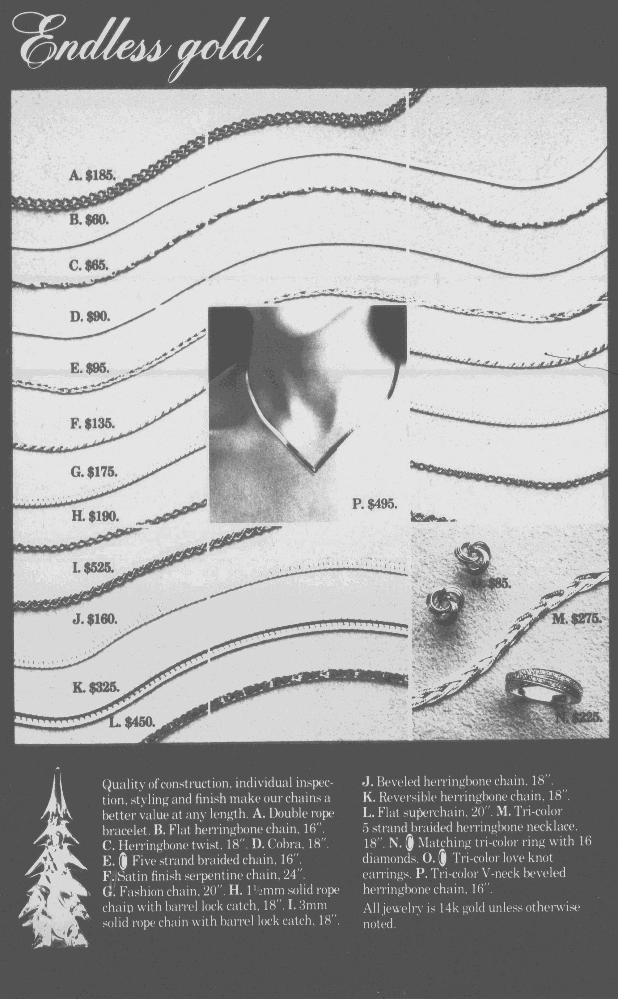 Quality of construction, individual inspc'c-tion, styling and finish make our chains a Ix'tter value at any length. A. Double I'opt' bracelet. B. Flat heri'ingbone chain. 16".
