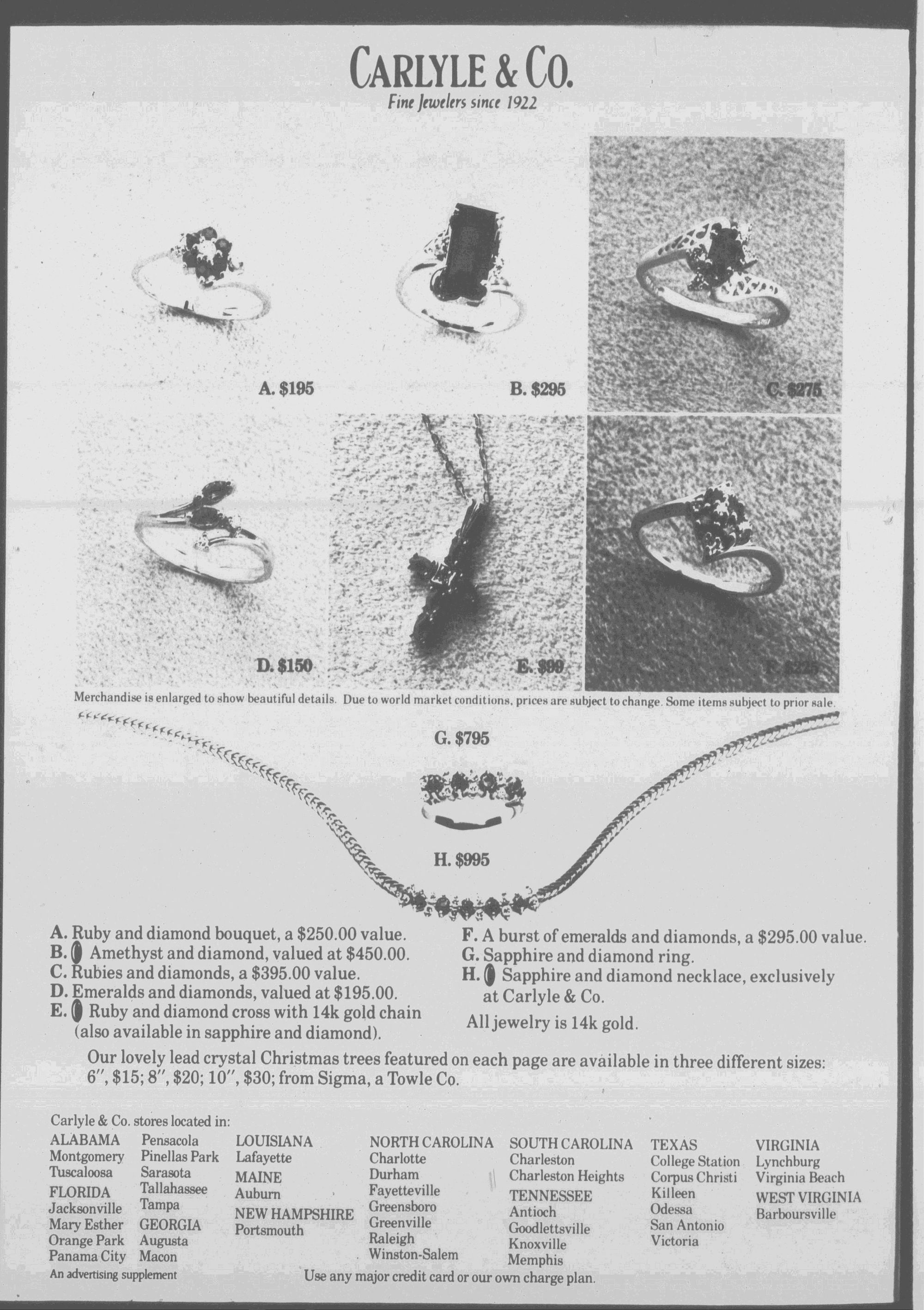 Carlyle & Co. stores located in: ALABAMA Pensacola Montgomery Pinellas Park Tuscaloosa Sarasota FLORIDA Tallahassee Jacksonville Tanipa Maty Esther GEORGIA Orange Park Augusta Panama City Macon An advertising supplement