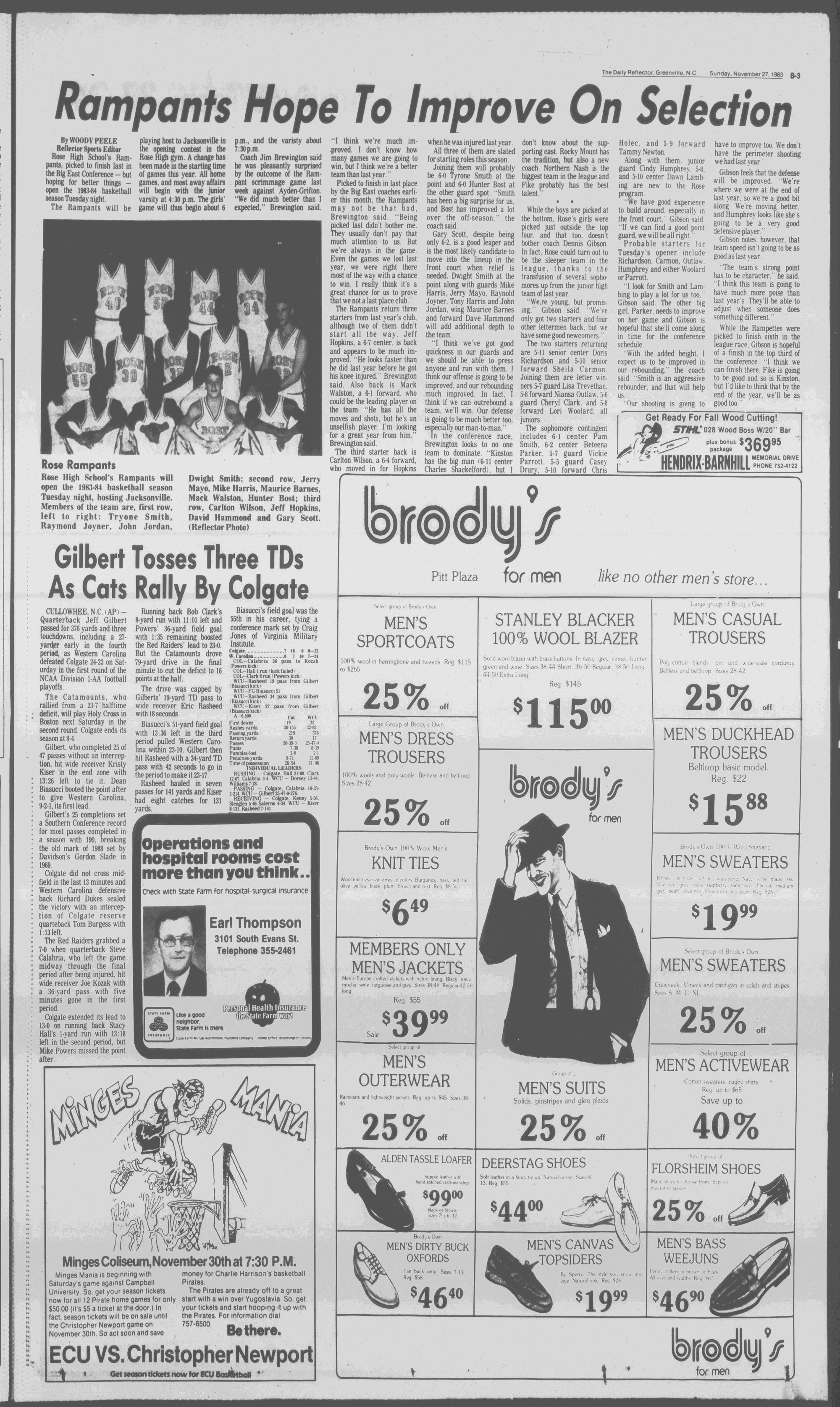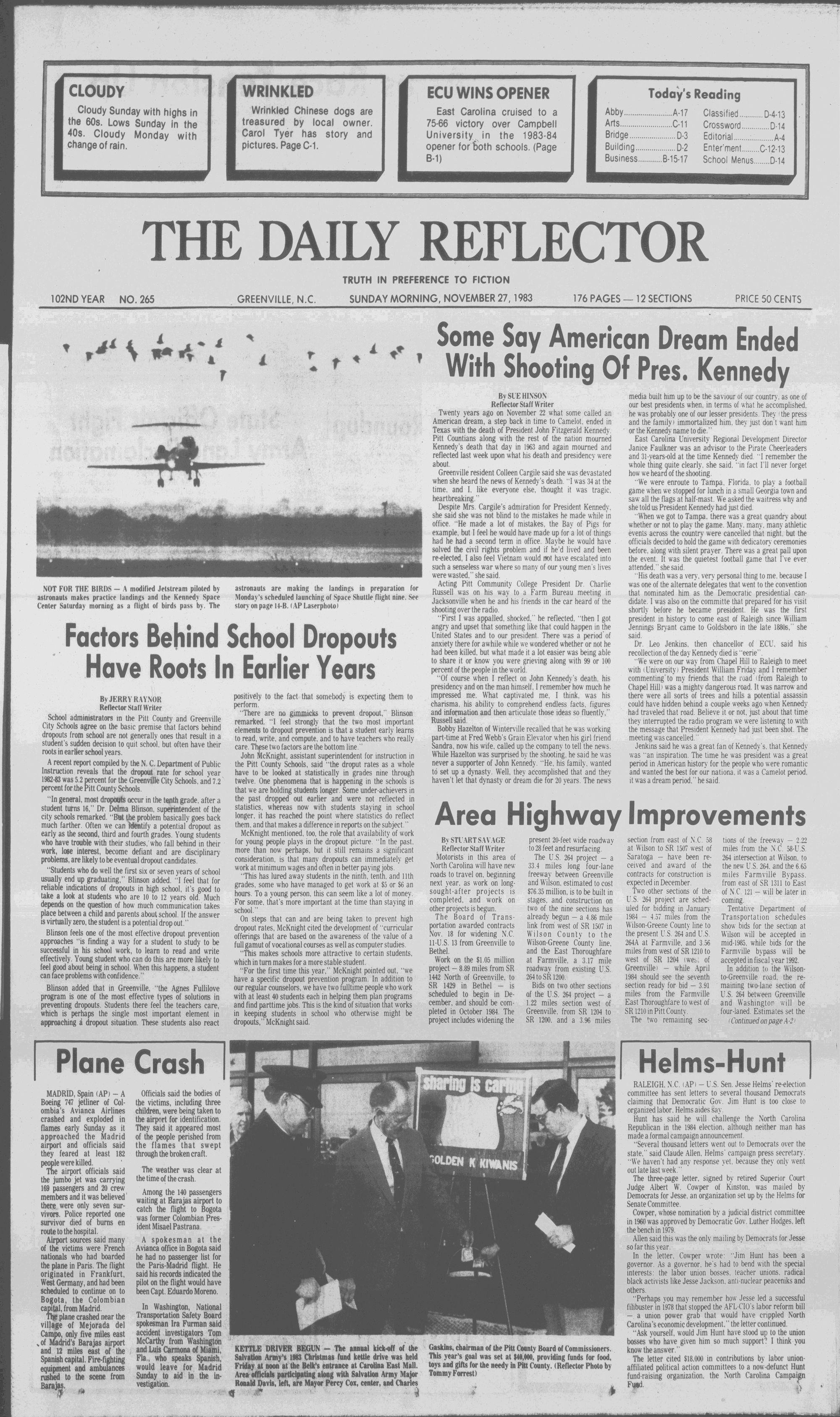 "We were on our way from'Chapel Hill to Raleigh to meet with (University) President William Friday and I remember commenting'to my friends that the road (from Raleigh to Chapel Hill) was a mighty dangerous road. It was narrow and there were all sorts of trees and hills a potential assassin could have hidden behind a couple weeks ago when Kennedy had traveled that road. Believe it or not. just about that time they interrupted the radio program we were listening to with the message that President Kennedy had just been shot. The meeting was cancelled."