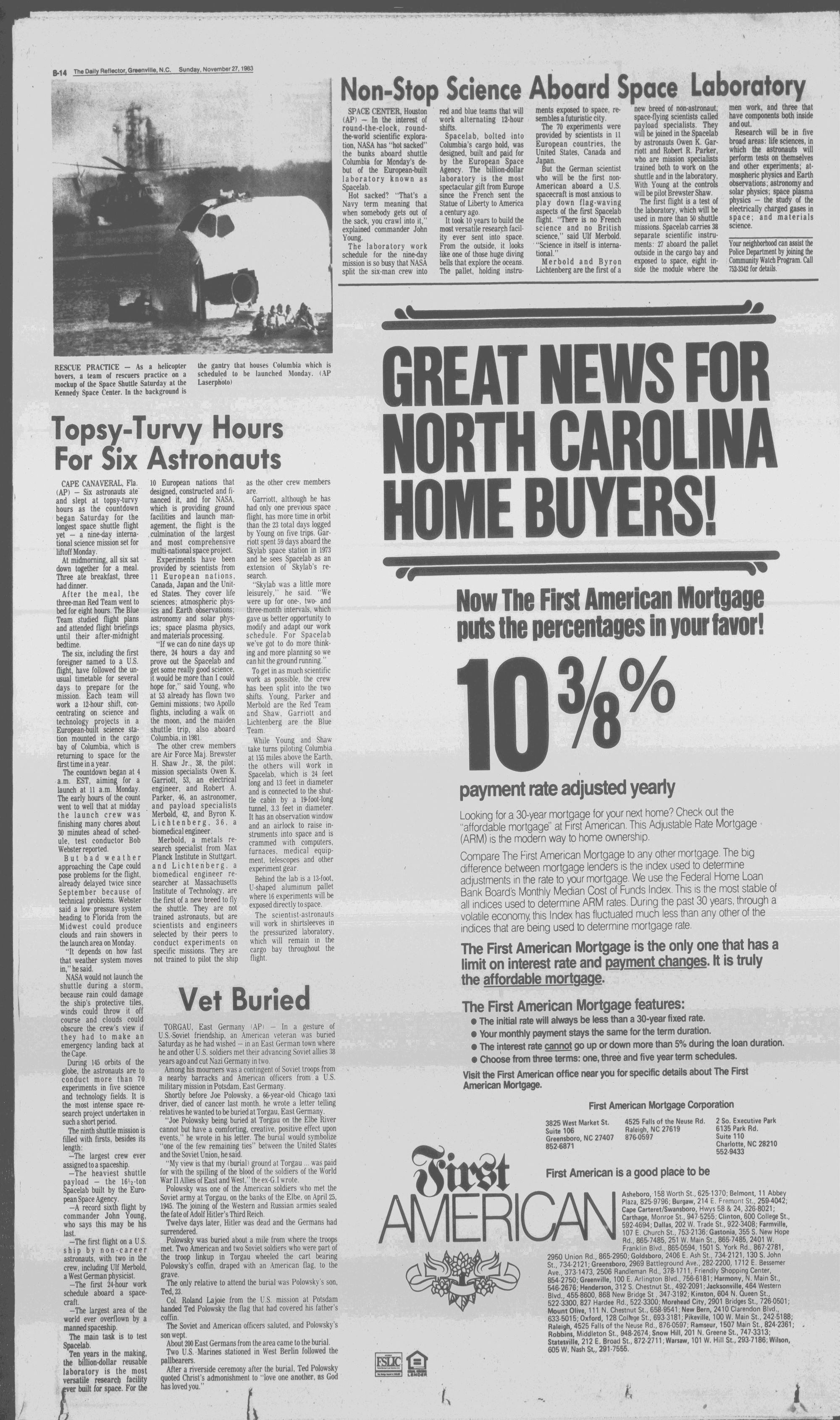 astronauts are making the landings in preparation for .Mondays scheduled launching of Space Shuttle flight nine. .See story on page 14-B. (AP Laserphoto)