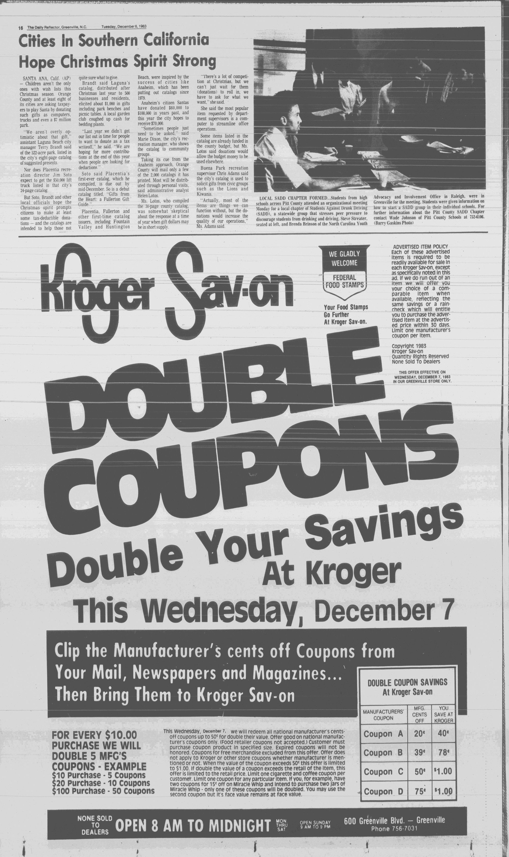 This Wednesday, December 7, vve Will redeem all national manufacturers cents-off coupons up to 50* for double their value. Offer good on national manufacturers coupons only. (Food retailer coupons not accepted.) Customer must purchase coupon product In specified size. Expired coupons will not be honored. Coupons for free merchandise excluded from this offer. Offer does not apply to Kroger or other store coupons whether manufacturer Is mentioned or not. When the value of the coupon exceeds 50* this offer Is limited to $1.00. If double the value of a coupon exceeds the retail of the Item, this offer Is limited to the retail price. Limit one cigarette and coffee coupon per customer. Limit one coupon for any particular Item, if you, for example, have two coupons for 15* off on Miracle whip and Intend to purchase two Jars of Miracle Whip - only one of these coupons will be doubled. You may use the second coupon but It's face value remains at face value.