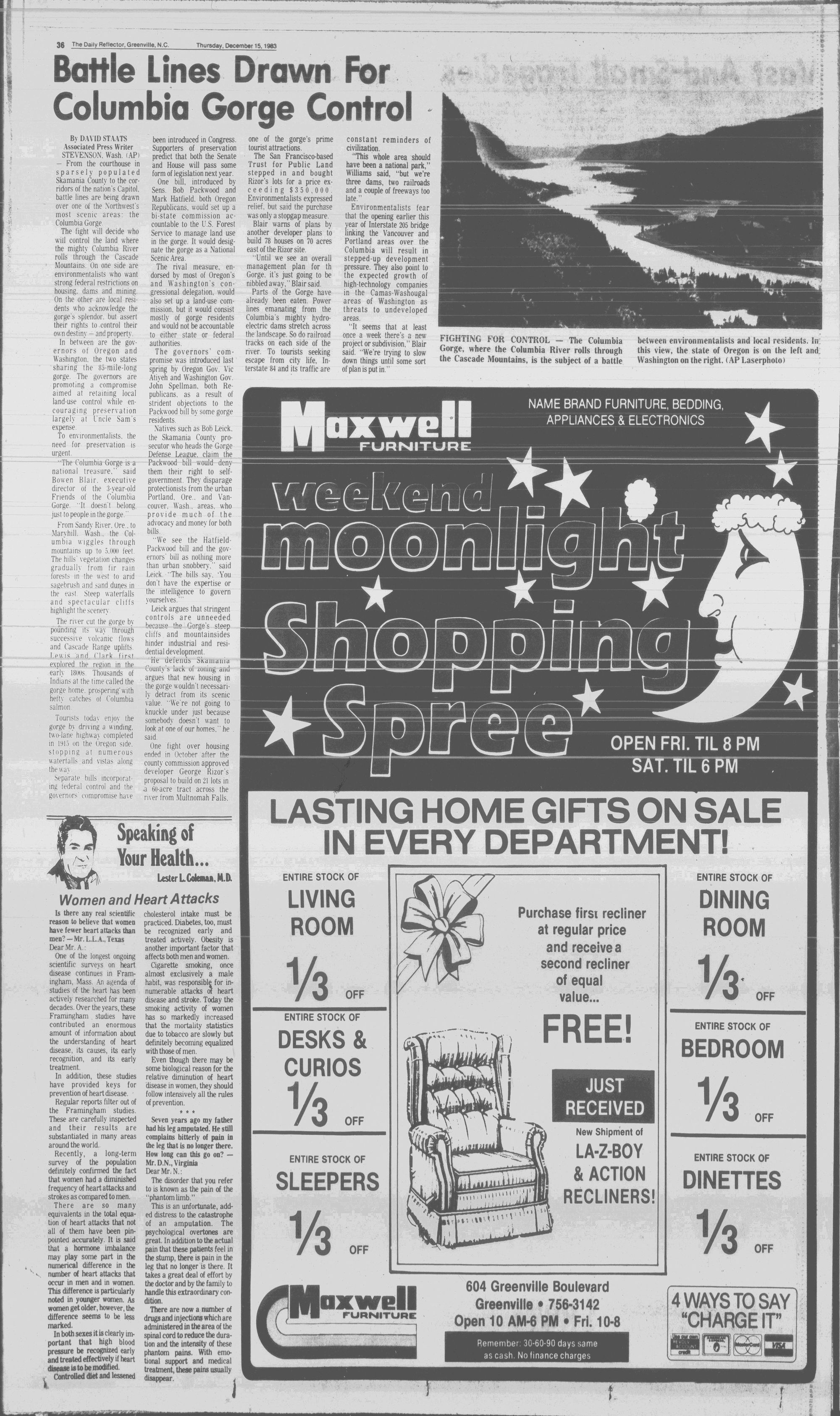 One bill, introduced by Sens. Bob Packwood and Mark Hatfield, both Oregon Republicans, would set up a bi-state commission accountable to the U.S. Forest Service to manage land use in the gorge. It would designate the gorge as a National Scenic Area.