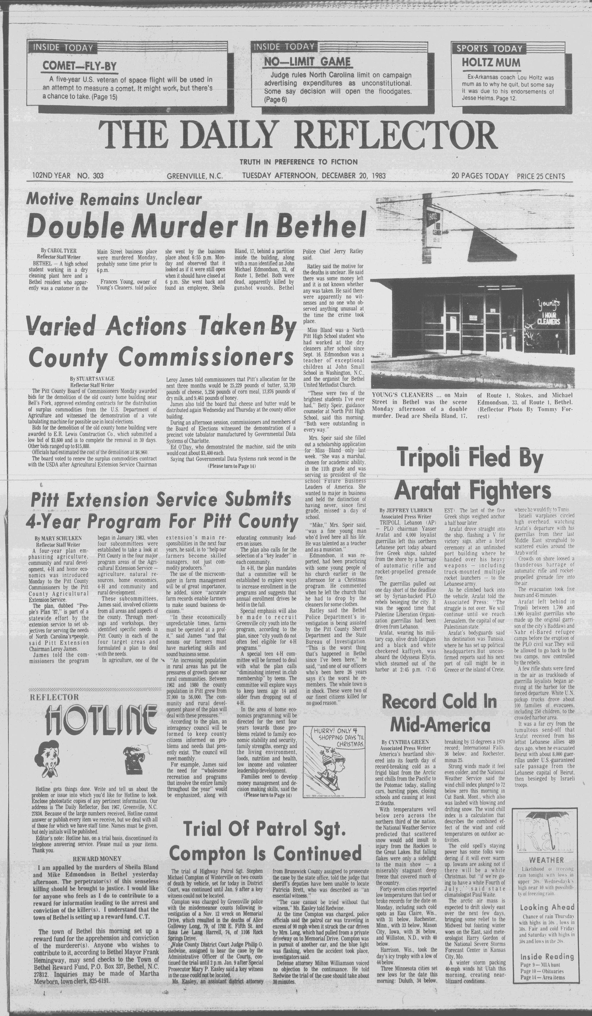 The town of Bethel this morning set up a reward fund for the apprehension and conviction of the murderer(s). Anyone who wishes to contribute to it, according to Bethel Mayor Frank Hemingway, may send checks to the Town of Bettiel Reward Fund, P.O. Box 337, Bethel, N.C. 27812. Inquiries may be made of Martha Mewborn, town clerk, 825-6191.